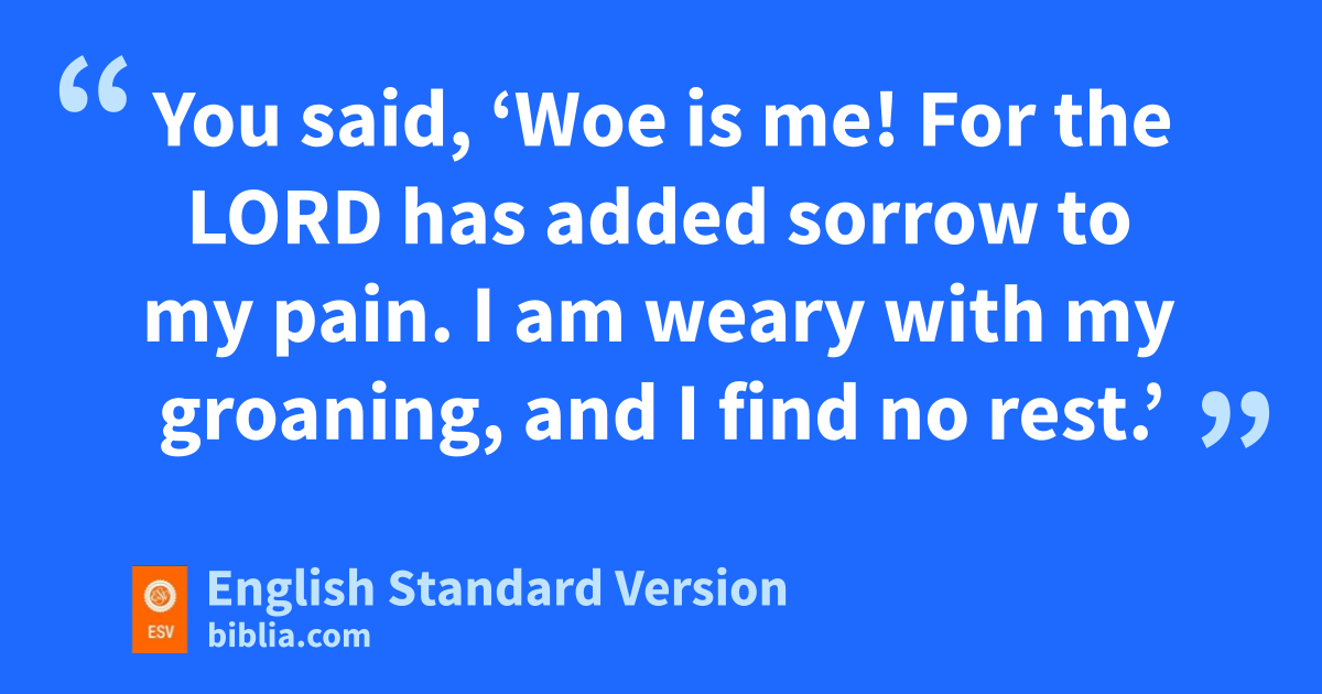 45 The word that Jeremiah the prophet spoke to sBaruch the son of Neriah, twhen he wrote these words in a book at the dictation of Jeremiah, uin the fourth year of Jehoiakim the son of Josiah, king of Judah: 2 “Thus says the Lord, the God of Israel, to you, O Baruch: 3 You said, v‘Woe is me! For the Lord has added sorrow to my pain. wI am weary with my groaning, xand I find no rest.’ 4 Thus shall you say to him, Thus says the Lord: yBehold, what I have built I am breaking down, and what I have planted I am plucking up—that is, the whole land. 5 And zdo you seek great things for yourself? Seek them not, for behold, aI am bringing disaster upon all flesh, declares the Lord. But I will give you byour life as a prize of war in all places to which you may go.”