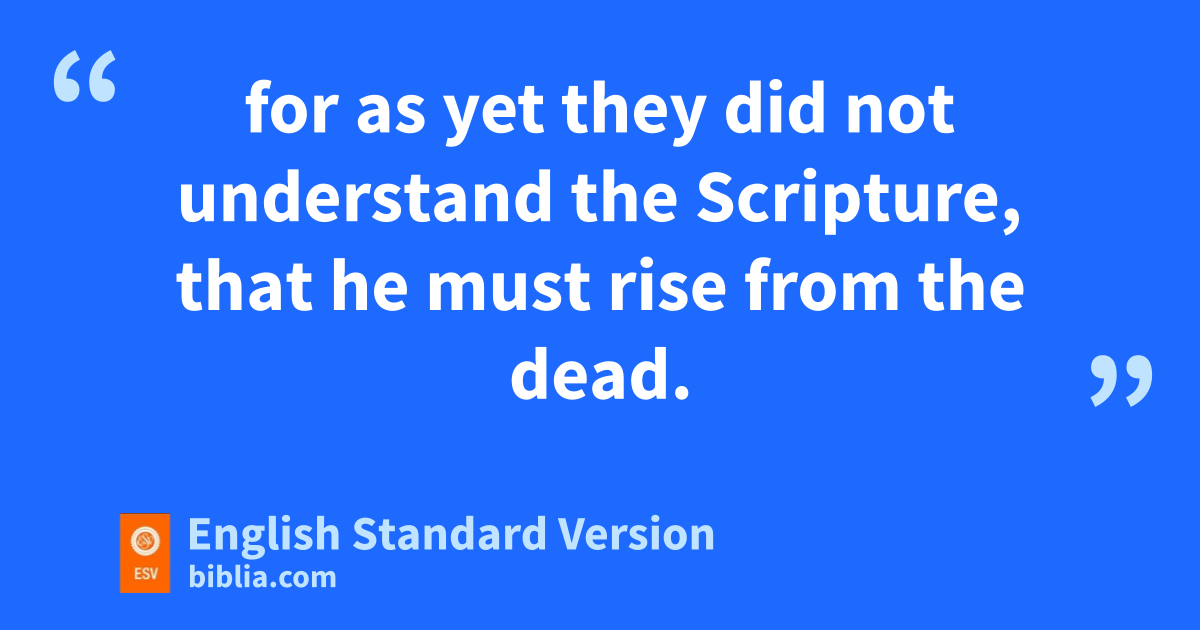 20 eNow on the first day of the week Mary Magdalene came to the tomb early, while it was still dark, and saw that fthe stone had been taken away from the tomb. 2 So she ran and went to Simon Peter and the other disciple, gthe one whom Jesus loved, and said to them, “They have taken the Lord out of the tomb, and hwe do not know where they have laid him.” 3 iSo Peter went out with the other disciple, and they were going toward the tomb. 4 Both of them were running together, but the other disciple outran Peter and reached the tomb first. 5 And stooping to look in, he saw jthe linen cloths lying there, but he did not go in. 6 Then Simon Peter came, following him, and went into the tomb. He saw the linen cloths lying there, 7 and kthe face cloth, which had been on Jesus’1 head, not lying with the linen cloths but folded up in a place by itself. 8 Then the other disciple, lwho had reached the tomb first, also went in, and he saw and believed; 9 for as yet mthey did not understand the Scripture, nthat he must rise from the dead. 10 Then the disciples went back to their homes.
