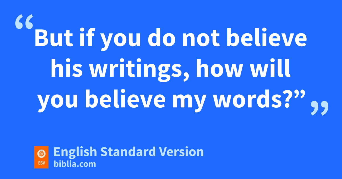 30 d“I can do nothing on my own. As I hear, I judge, and emy judgment is just, because fI seek not my own will gbut the will of him who sent me. 31 hIf I alone bear witness about myself, my testimony is not true. 32 There is ianother who bears witness about me, and jI know that the testimony that he bears about me is true. 33 kYou sent to John, and he has borne witness to the truth. 34 Not that lthe testimony that I receive is from man, but I say these things so that you may be saved. 35 He was a burning and mshining lamp, and nyou were willing to rejoice for a while in his light. 36 But lthe testimony that I have is greater than that of John. For othe works that the Father has given me pto accomplish, the very works that I am doing, qbear witness about me that rthe Father has sent me. 37 And the Father who sent me shas himself borne witness about me. His voice you have never heard, this form you have never seen, 38 and uyou do not have his word abiding in you, for you do not believe the one whom he has sent. 39 vYou search the Scriptures because you think that in them you have eternal life; and wit is they that bear witness about me, 40 yet xyou refuse to come to me that you may have life. 41 yI do not receive glory from people. 42 But zI know that you do not have athe love of God within you. 43 I have come bin my Father’s name, and cyou do not receive me. dIf another comes in his own name, you will receive him. 44 How can you believe, when you receive glory from one another and edo not seek the glory that comes from fthe only God? 45 Do not think that I will accuse you to the Father. There is one who accuses you: Moses, gon whom you have set your hope. 46 For if you believed Moses, you would believe me; for hhe wrote of me. 47 But iif you do not believe his writings, how will you believe my words?”