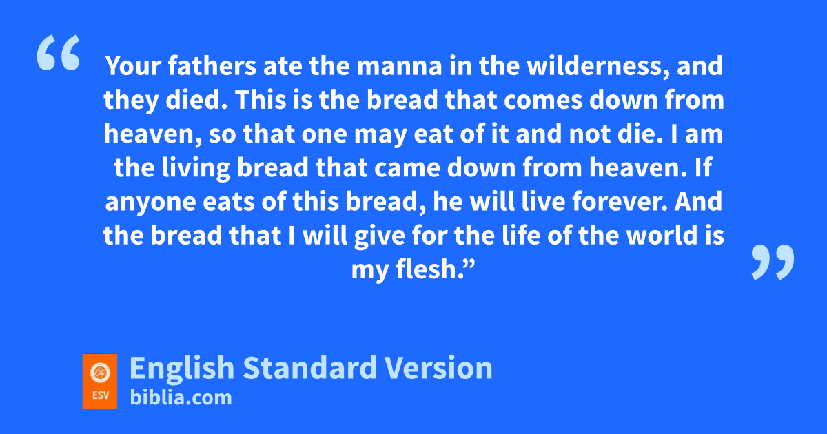 52 The Jews then hdisputed among themselves, saying, i“How can this man give us his flesh to eat?” 53 So Jesus said to them, “Truly, truly, I say to you, unless you eat the flesh of jthe Son of Man and drink his blood, you khave no life in you. 54 Whoever feeds on my flesh and drinks my blood lhas eternal life, and mI will raise him up on the last day. 55 For my flesh is true food, and my blood is true drink. 56 Whoever feeds on my flesh and drinks my blood nabides in me, and I in him. 57 As othe living Father psent me, and qI live because of the Father, so whoever feeds on me, he also will live because of me. 58 rThis is the bread that came down from heaven, not like the bread3 the fathers ate, and died. Whoever feeds on this bread will live forever.” 59 Jesus4 said these things in the synagogue, as he taught sat Capernaum.