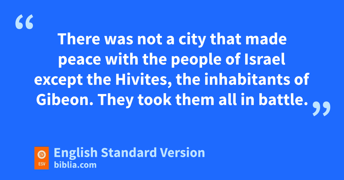 16 So Joshua took all that land, xthe hill country and all the Negeb and yall the land of Goshen zand the lowland zand the Arabah aand the hill country of Israel and its lowland 17 bfrom Mount Halak, which rises toward Seir, as far as cBaal-gad in the Valley of Lebanon below dMount Hermon. And he captured eall their kings and struck them and put them to death. 18 Joshua made war fa long time with all those kings. 19 There was not a city that made peace with the people of Israel except gthe Hivites, the inhabitants of Gibeon. They took them all in battle. 20 For it was the Lord’s doing hto harden their hearts that they should come against Israel in battle, in order that they should be devoted to destruction and should receive no mercy but be destroyed, ijust as the Lord commanded Moses.