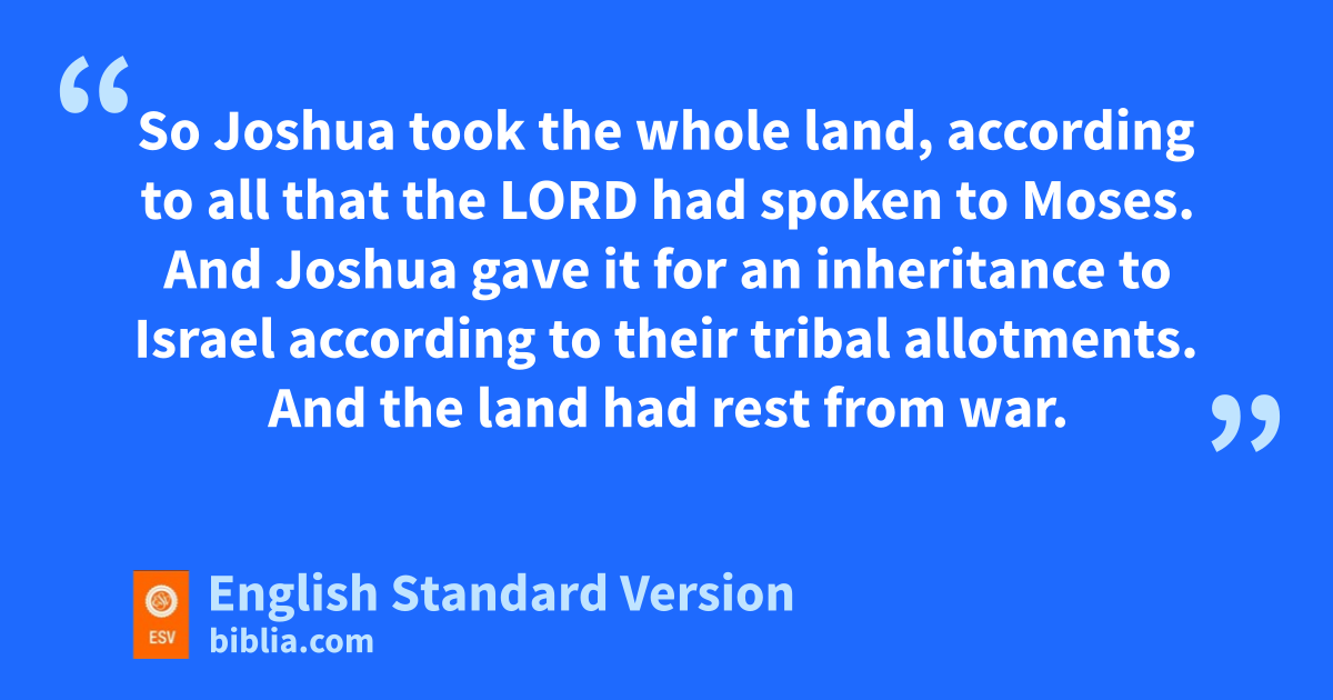 21 And Joshua came at that time and cut off jthe Anakim from the hill country, from Hebron, from Debir, from Anab, and from all the hill country of Judah, and from all the hill country of Israel. Joshua devoted them to destruction with their cities. 22 There was none of the Anakim left in the land of the people of Israel. Only in Gaza, kin Gath, and in Ashdod did some remain. 23 So Joshua took the whole land, laccording to all that the Lord had spoken to Moses. mAnd Joshua gave it for an inheritance to Israel naccording to their tribal allotments. And the land had rest from war.