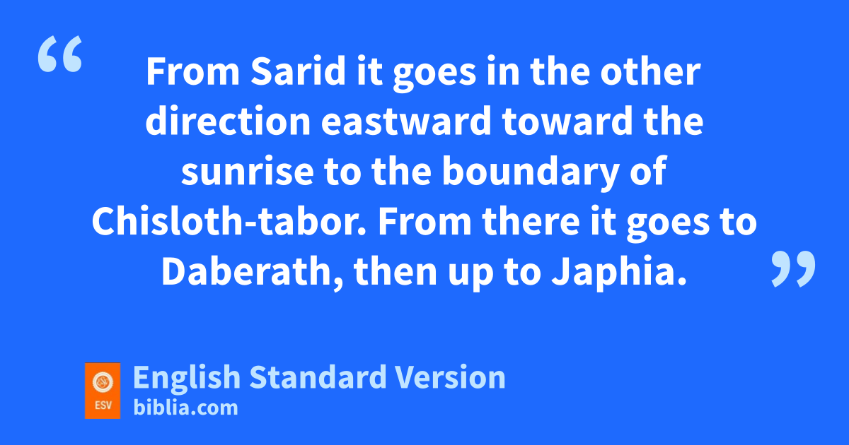 10 The third lot came up for the people of Zebulun, according to their clans. And the territory of their inheritance reached as far as Sarid. 11 Then their boundary goes up swestward and on to Mareal and touches Dabbesheth, then the brook that is east of tJokneam. 12 From Sarid it goes in the other direction eastward toward the sunrise to the boundary of Chisloth-tabor. From there it goes to Daberath, then up to Japhia. 13 From there it passes along on the east toward the sunrise to Gath-hepher, to Eth-kazin, and going on to Rimmon it bends toward Neah, 14 then on the north the boundary turns about to Hannathon, and it ends at the Valley of Iphtahel; 15 and Kattath, Nahalal, uShimron, Idalah, and Bethlehem—twelve cities with their villages. 16 This is the inheritance of the people of Zebulun, according to their clans—these cities with their villages.