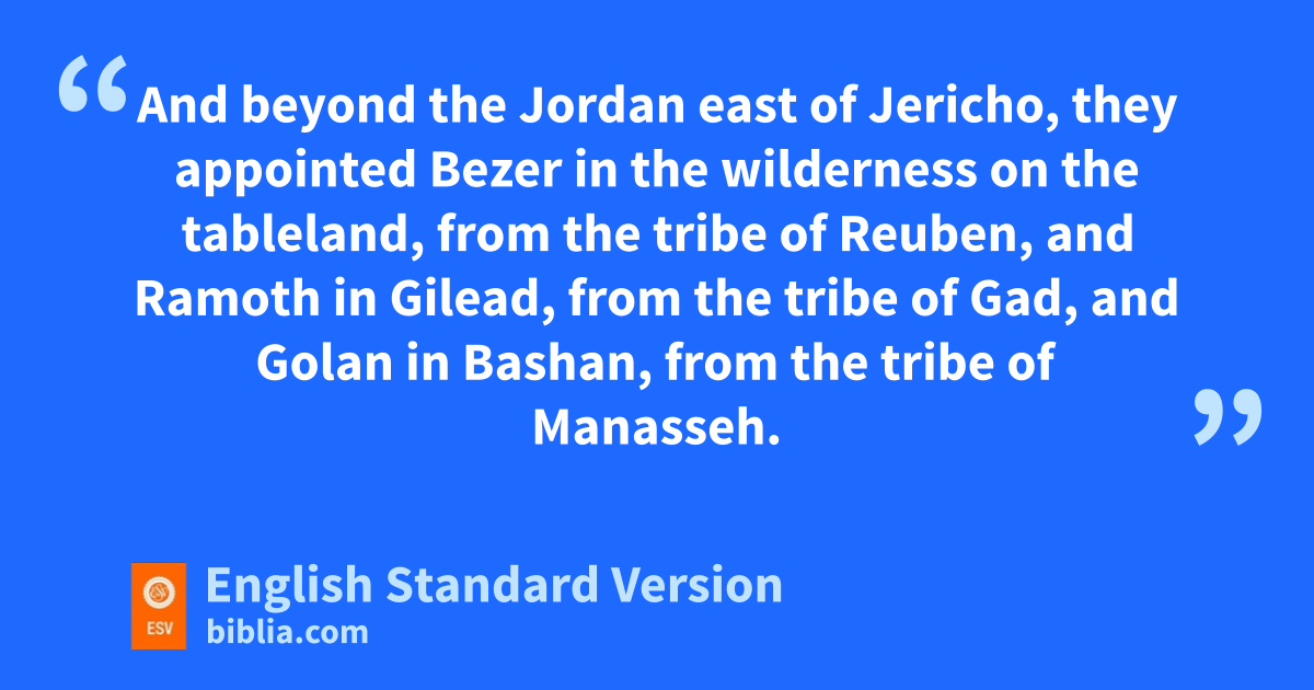 7 So they set apart mKedesh in Galilee in the hill country of Naphtali, and nShechem in the hill country of Ephraim, and oKiriath-arba (that is, Hebron) pin the hill country of Judah. 8 And beyond the Jordan east of Jericho, they appointed qBezer in the wilderness on the tableland, from the tribe of Reuben, and rRamoth in Gilead, from the tribe of Gad, and sGolan in Bashan, from the tribe of Manasseh. 9 These were the cities designated for all the people of Israel and tfor the stranger sojourning among them, that anyone who killed a person without intent could flee there, so that he might not die by the hand of the avenger of blood, till he stood before the congregation.