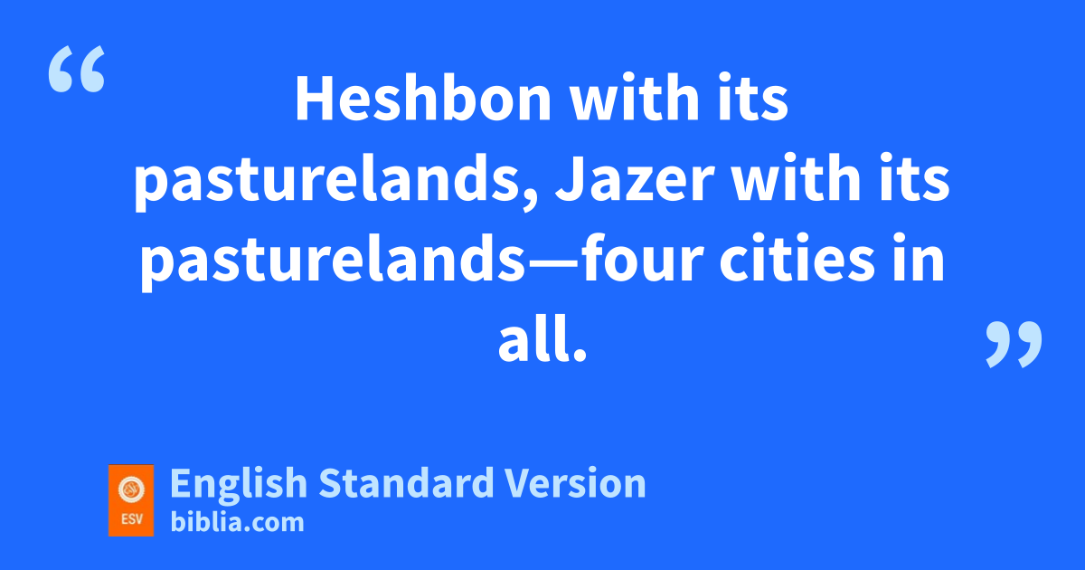 34 nAnd to the rest of the Levites, the Merarite clans, were given out of the tribe of Zebulun, Jokneam with its pasturelands, Kartah with its pasturelands, 35 Dimnah with its pasturelands, Nahalal with its pasturelands—four cities; 36 and out of the tribe of Reuben, oBezer with its pasturelands, Jahaz with its pasturelands, 37 Kedemoth with its pasturelands, and Mephaath with its pasturelands—four cities; 38 and out of the tribe of Gad, oRamoth in Gilead with its pasturelands, the city of refuge for the manslayer, pMahanaim with its pasturelands, 39 pHeshbon with its pasturelands, Jazer with its pasturelands—four cities in all. 40 As for the cities of the several Merarite clans, that is, the remainder of the clans of the Levites, those allotted to them were in all twelve cities.