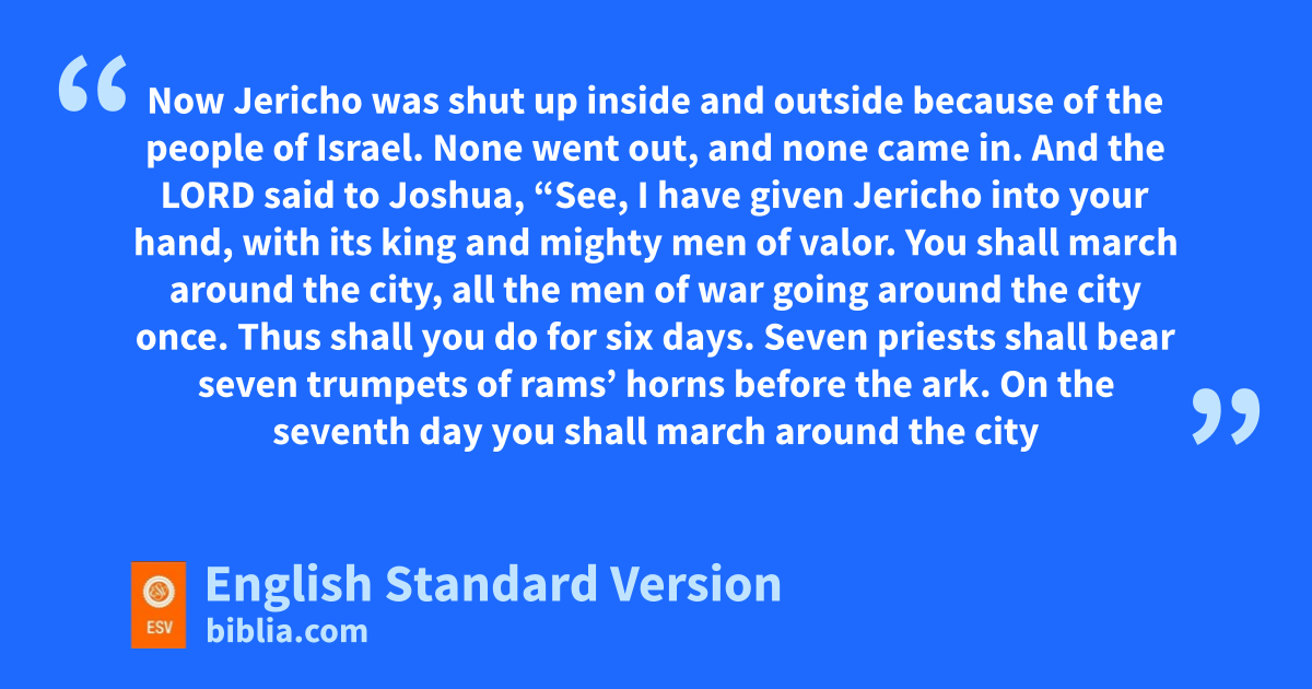 6 Now Jericho was shut up inside and outside because of the people of Israel. None went out, and none came in. 2 And the Lord said to Joshua, “See, gI have given Jericho into your hand, with its king and mighty men of valor. 3 You shall march around the city, all the men of war going around the city once. Thus shall you do for six days. 4 Seven priests shall bear seven htrumpets of irams’ horns before the ark. On the seventh day you shall march around the city seven times, and jthe priests shall blow the trumpets. 5 And when they make a long blast with the ram’s horn, when you hear the sound of the trumpet, then all the people shall shout with a great shout, and the wall of the city will fall down flat,1 and the people shall go up, everyone straight before him.” 6 So Joshua the son of Nun called the priests and said to them, “Take up the ark of the covenant and let seven priests bear seven trumpets of rams’ horns before the ark of the Lord.” 7 And he said to the people, “Go forward. March around the city and let kthe armed men pass on before the ark of the Lord.”