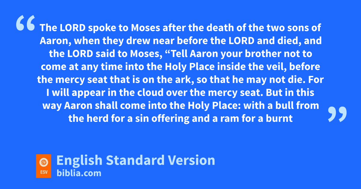 16 The Lord spoke to Moses after cthe death of the two sons of Aaron, when they drew near before the Lord and died, 2 and the Lord said to Moses, “Tell Aaron your brother not to dcome at any time into the Holy Place inside the veil, before the mercy seat that is on the ark, so that he may not die. For eI will appear in the cloud over the mercy seat. 3 But in this way Aaron shall come into the Holy Place: fwith a bull from the herd for a sin offering and ga ram for a burnt offering. 4 He shall put on hthe holy linen coat and shall have the linen undergarment on his body, and he shall tie the linen sash around his waist, and wear the linen turban; these are the holy garments. iHe shall bathe his body in water and then put them on. 5 And he shall take from jthe congregation of the people of Israel two male goats for a sin offering, and one ram for a burnt offering.