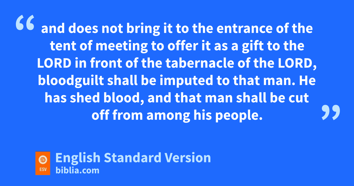 17 And the Lord spoke to Moses, saying, 2 “Speak to Aaron and his sons and to all the people of Israel and say to them, This is the thing that the Lord has commanded. 3 If any one of the house of Israel ukills an ox or a lamb or a goat in the camp, or kills it outside the camp, 4 and vdoes not bring it to the entrance of the tent of meeting to offer it as a gift to the Lord in front of the tabernacle of the Lord, bloodguilt shall be imputed to that man. He has shed blood, and that man wshall be cut off from among his people. 5 This is to the end that the people of Israel may bring their sacrifices that they sacrifice xin the open field, that they may bring them to the Lord, to the priest at the entrance of the tent of meeting, and sacrifice them yas sacrifices of peace offerings to the Lord. 6 And the priest shall ythrow the blood on the altar of the Lord at the entrance of the tent of meeting and burn the fat zfor a pleasing aroma to the Lord. 7 So they shall no more sacrifice their sacrifices to goat demons, after whom they awhore. This shall be a statute forever for them throughout their generations.