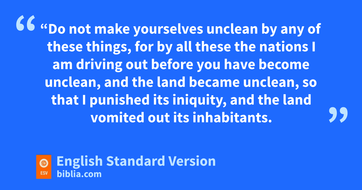 24 k“Do not make yourselves unclean by any of these things, lfor by all these the nations I am driving out before you have become unclean, 25 and the mland became unclean, so that I punished its iniquity, and the land nvomited out its inhabitants. 26 But oyou shall keep my statutes and my rules and do none of these abominations, either the pnative or the stranger who sojourns among you 27 (for the people of the land, who were before you, did all of these abominations, so that the land became unclean), 28 lest the land vomit you out when you make it unclean, as it vomited out the nation that was before you. 29 For everyone who does any of these abominations, the persons who do them shall be cut off from among their people. 30 qSo keep my charge never to practice rany of these abominable customs that were practiced before you, and never to make yourselves unclean by them: sI am the Lord your God.”