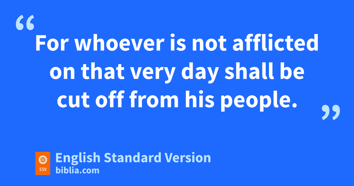 26 And the Lord spoke to Moses, saying, 27 “Now non the tenth day of this seventh month is the Day of Atonement. It shall be for you a time of holy convocation, and you shall afflict yourselves4 and present a food offering to the Lord. 28 And you shall not do any work on that very day, for it is a Day of Atonement, to make atonement for you before the Lord your God. 29 For whoever is not afflicted5 on that very day oshall be cut off from his people. 30 And whoever does any work on that very day, that person I will destroy from among his people. 31 You shall not do any work. It is a statute forever throughout your generations in all your dwelling places. 32 It shall be to you a Sabbath of solemn rest, and you shall afflict yourselves. On the ninth day of the month beginning at evening, from evening to evening shall you keep your Sabbath.”