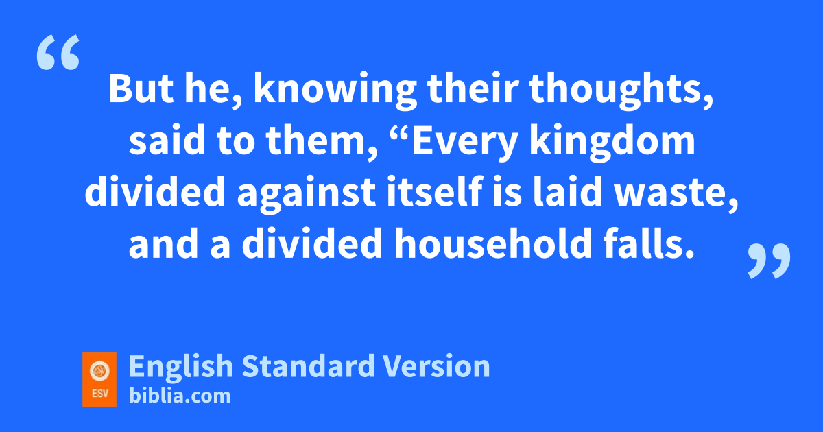 14 yNow he was casting out a demon that was mute. When the demon had gone out, the mute man spoke, and the people marveled. 15 But some of them said, “He casts out demons zby Beelzebul, the prince of demons,” 16 while others, ato test him, kept seeking from him a sign from heaven. 17 bBut he, cknowing their thoughts, said to them, “Every kingdom divided against itself is laid waste, and a divided household falls. 18 And if Satan also is divided against himself, how will his kingdom stand? For you say that I cast out demons by Beelzebul. 19 And if I cast out demons by Beelzebul, dby whom do eyour sons cast them out? Therefore they will be your judges. 20 But if it is by fthe finger of God that I cast out demons, then gthe kingdom of God has come upon you. 21 When a strong man, fully armed, guards his own palace, his goods are safe; 22 hbut when one stronger than he attacks him and iovercomes him, he takes away his jarmor in which he trusted and kdivides his spoil. 23 lWhoever is not with me is against me, and whoever does not gather with me scatters.