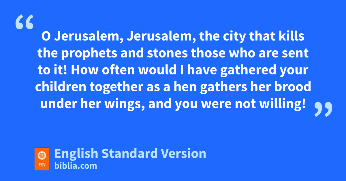31 At that very hour some Pharisees came and said to him, “Get away from zhere, for aHerod wants to kill you.” 32 And he said to them, “Go and tell that fox, ‘Behold, I cast out demons and perform cures today and tomorrow, and the third day bI finish my course. 33 Nevertheless, cI dmust go on my way today and tomorrow and the day following, for it cannot be that ea prophet should perish away from Jerusalem.’ 34 fO Jerusalem, Jerusalem, the city that gkills the prophets and stones those who are sent to it! hHow often would I have igathered jyour children together kas a hen gathers her brood lunder her wings, and myou were not willing! 35 Behold, nyour house is forsaken. And I tell you, you will not see me until you say, o‘Blessed is he who comes in the name of the Lord!’ ”