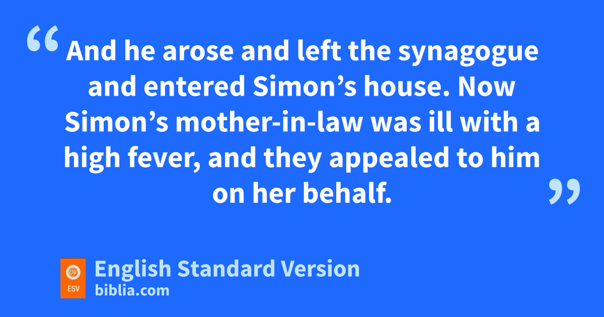 38 gAnd he arose and left the synagogue and entered Simon’s house. Now hSimon’s mother-in-law was ill with a high fever, and they appealed to him on her behalf. 39 And he stood over her and irebuked the fever, and it left her, and immediately she rose and began to serve them.