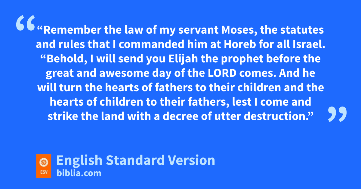5 d“Behold, I will send you eElijah the prophet fbefore the great and awesome day of the Lord comes. 6 And he will gturn the hearts of fathers to their children and the hearts of children to their fathers, lest I come and hstrike the land with a decree of utter destruction.”3