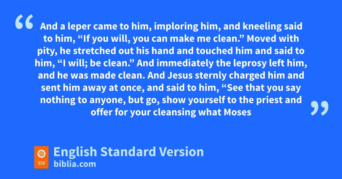 40 iAnd a leper8 came to him, imploring him, and jkneeling said to him, k“If you will, you can make me clean.” 41 Moved with pity, he stretched out his hand and touched him and said to him, “I will; be clean.” 42 And immediately the leprosy left him, and he was made clean. 43 And lJesus9 sternly charged him and sent him away at once, 44 and said to him, m“See that you say nothing to anyone, but go, nshow yourself to the priest and ooffer for your cleansing what Moses commanded, pfor a proof to them.” 45 qBut he went out and began to talk freely about it, and to spread the news, so that Jesus could no longer openly enter ra town, but was out in rdesolate places, and speople were coming to him from every quarter.