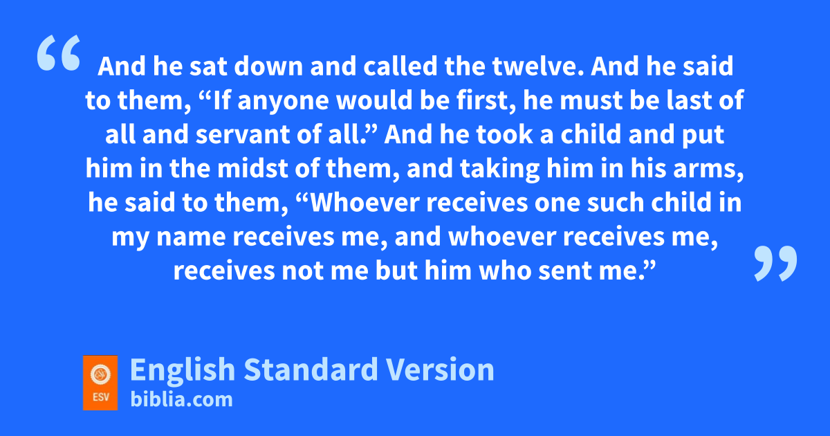 33 And zthey came to Capernaum. And when he was in the house ahe asked them, “What were you discussing on the way?” 34 But they kept silent, for on the way bthey had argued with one another about who was the greatest. 35 And he sat down and called the twelve. And he said to them, c“If anyone would be first, he must be last of all and servant of all.” 36 And he took a child and put him in the midst of them, and dtaking him in his arms, he said to them, 37 e“Whoever receives one such child in my name receives me, and ewhoever receives me, receives not me but him who sent me.”