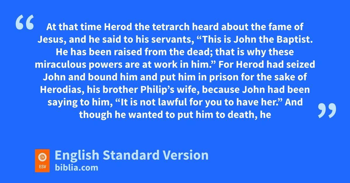 14 vAt that time wHerod the tetrarch heard about the fame of Jesus, 2 and he said to his servants, x“This is John the Baptist. He has been raised from the dead; that is why these miraculous powers are at work in him.” 3 For yHerod had seized John and bound him and zput him in prison for the sake of Herodias, his brother Philip’s wife,1 4 because John had been saying to him, a“It is not lawful for you to have her.” 5 And though he wanted to put him to death, bhe feared the people, because they held him to be ca prophet. 6 But when Herod’s dbirthday came, the daughter of Herodias danced before the company and pleased Herod, 7 so that he promised with an oath to give her whatever she might ask. 8 Prompted by her mother, she said, “Give me the head of John the Baptist here on a platter.” 9 And the king was sorry, but because of his oaths and his guests he commanded it to be given. 10 He sent and had John beheaded in the prison, 11 and his head was brought on a platter and given to the girl, and she brought it to her mother. 12 And ehis disciples came and took the body and buried it, and they went and told Jesus.