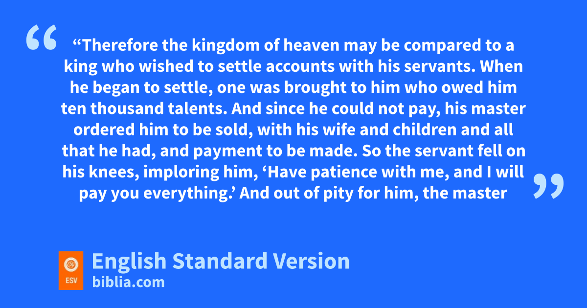 23 “Therefore the kingdom of heaven may be compared to a king who wished ato settle accounts with his servants.7 24 When he began to settle, one was brought to him who owed him bten thousand ctalents.8 25 dAnd since he could not pay, his master ordered him eto be sold, with his wife and fchildren and all that he had, and payment to be made. 26 So the servant9 gfell on his knees, imploring him, ‘Have patience with me, and I will pay you everything.’ 27 And out of pity for him, the master of that servant released him and dforgave him the debt. 28 But when that same servant went out, he found one of his fellow servants who owed him a hundred hdenarii,10 and seizing him, he began to choke him, saying, ‘Pay what you owe.’ 29 So his fellow servant fell down and pleaded with him, ‘Have patience with me, and I will pay you.’ 30 He refused and went and put him in prison until he should pay the debt. 31 When his fellow servants saw what had taken place, they were greatly distressed, and they went and reported to their master all that had taken place. 32 Then his master summoned him and said to him, ‘You wicked servant! I forgave you all that debt because you pleaded with me. 33 iAnd should not you have had mercy on your fellow servant, as I had mercy on you?’ 34 jAnd in anger his master delivered him to the jailers,11 kuntil he should pay all his debt. 35 lSo also my heavenly Father will do to every one of you, if you do not forgive your brother mfrom your heart.”