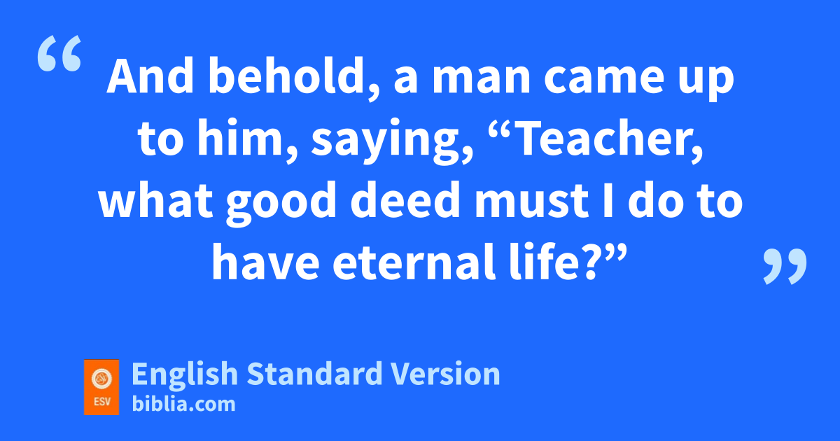 16 iAnd behold, a man came up to him, saying, “Teacher, what good deed must I do to jhave keternal life?” 17 And he said to him, “Why do you ask me about what is good? There is only one who is good. lIf you would enter life, keep the commandments.” 18 He said to him, “Which ones?” And Jesus said, m“You shall not murder, You shall not commit adultery, You shall not steal, You shall not bear false witness, 19 Honor your father and mother, and, nYou shall love your neighbor as yourself.” 20 The young man said to him, o“All these I have kept. What do I still lack?” 21 Jesus said to him, “If you would be pperfect, go, qsell what you possess and give to the poor, and you will have rtreasure in heaven; and come, follow me.” 22 sWhen the young man heard this he went away sorrowful, for he had great possessions.