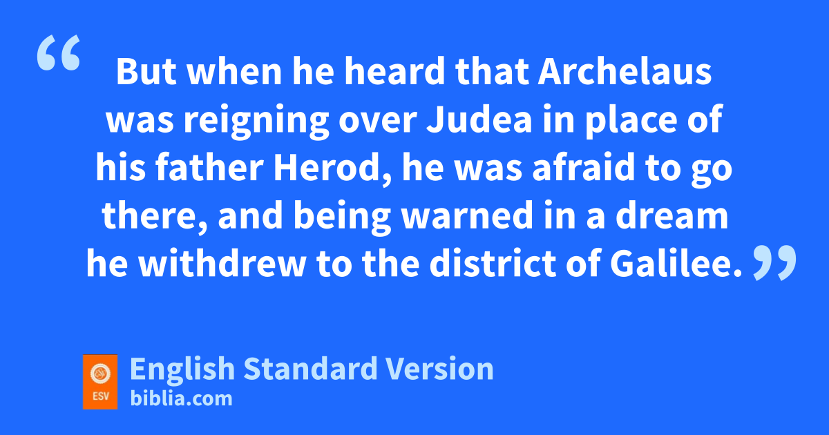 19 But when Herod died, behold, an angel of the Lord appeared in a dream to Joseph in Egypt, 20 saying, “Rise, take the child and his mother and go to the land of Israel, for dthose who sought the child’s life are dead.” 21 And he rose and took the child and his mother and went to the land of Israel. 22 But when he heard that Archelaus was reigning over Judea in place of his father Herod, he was afraid to go there, and ebeing warned in a dream he withdrew to the district of Galilee. 23 And he went and lived in a city called fNazareth, gso that what was spoken by the prophets might be fulfilled, that he would be called a Nazarene.