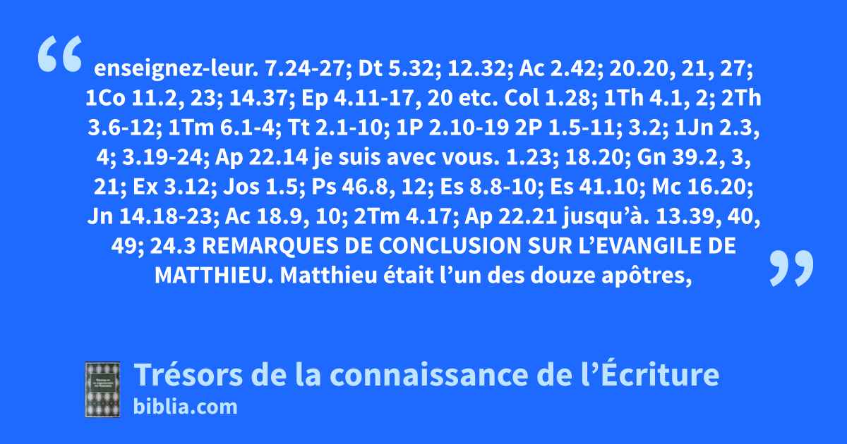 enseignez-leur. 7.24-27; Dt 5.32; 12.32; Ac 2.42; 20.20, 21, 27; 1Co 11.2, 23; 14.37; Ep 4.11-17, 20 etc. Col 1.28; 1Th 4.1, 2; 2Th 3.6-12; 1Tm 6.1-4; Tt 2.1-10; 1P 2.10-19 2P 1.5-11; 3.2; 1Jn 2.3, 4; 3.19-24; Ap 22.14 je suis avec vous. 1.23; 18.20; Gn 39.2, 3, 21; Ex 3.12; Jos 1.5; Ps 46.8, 12; Es 8.8-10; Es 41.10; Mc 16.20; Jn 14.18-23; Ac 18.9, 10; 2Tm 4.17; Ap 22.21 jusqu’à. 13.39, 40, 49; 24.3