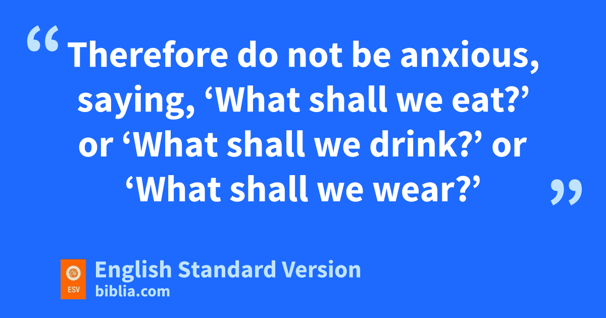 25 e“Therefore I tell you, fdo not be anxious about your life, what you will eat or what you will drink, nor about your body, what you will put on. Is not life more than food, and the body more than clothing? 26 gLook at the birds of the air: they neither sow nor reap nor gather into barns, and yet your heavenly Father feeds them. hAre you not of more value than they? 27 And which of you by being anxious can add a single hour to his ispan of life?7 28 And why are you anxious about clothing? Consider the lilies of the field, how they grow: they neither toil nor spin, 29 yet I tell you, jeven Solomon in all his glory was not arrayed like one of these. 30 But if God so clothes the grass of the field, which today is alive and tomorrow is thrown into the oven, will he not much more clothe you, kO you of little faith? 31 Therefore do not be anxious, saying, ‘What shall we eat?’ or ‘What shall we drink?’ or ‘What shall we wear?’ 32 For lthe Gentiles seek after all these things, and myour heavenly Father knows that you need them all. 33 But nseek first othe kingdom of God and his righteousness, pand all these things will be added to you.