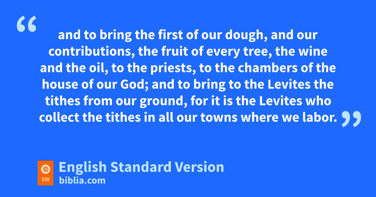 32 “We also take on ourselves the obligation to give yearly ua third part of a shekel3 for the service of the house of our God: 33 vfor the showbread, wthe regular grain offering, wthe regular burnt offering, the Sabbaths, the new moons, the appointed feasts, the holy things, and the sin offerings to make atonement for Israel, and for all the work of the house of our God. 34 xWe, the priests, the Levites, and the people, have likewise cast lots yfor the wood offering, to bring it into the house of our God, according to our fathers’ houses, at times appointed, year by year, to burn on the altar of the Lord our God, zas it is written in the Law. 35 We obligate ourselves ato bring the firstfruits of our ground and the firstfruits of all fruit of every tree, year by year, to the house of the Lord; 36 also to bring to the house of our God, to the priests who minister in the house of our God, the firstborn of our sons and of our cattle, bas it is written in the Law, and the firstborn of our herds and of our flocks; 37 cand to bring the first of our dough, and our contributions, the fruit of every tree, the wine and the oil, to the priests, dto the chambers of the house of our God; and to bring to the Levites the tithes from our ground, for it is the Levites who collect the tithes in all our towns where we labor. 38 And the priest, the son of Aaron, shall be with the Levites when the Levites receive the tithes. And the Levites shall bring up the tithe of the tithes to the house of our God, to the chambers of ethe storehouse. 39 For the people of Israel and the sons of Levi fshall bring the contribution of grain, wine, and oil to the chambers, where the vessels of the sanctuary are, as well as the priests who minister, and the gatekeepers and the singers. gWe will not neglect the house of our God.”