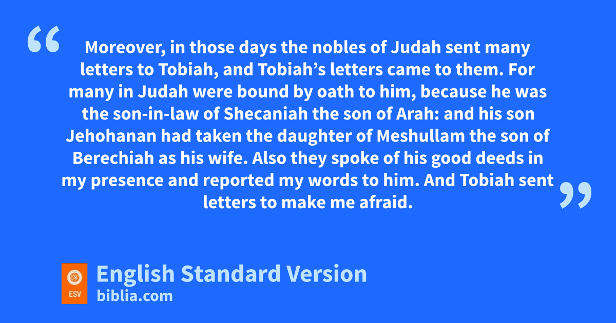 15 So the wall was finished on the twenty-fifth day of the month Elul, in fifty-two days. 16 And jwhen all our enemies heard of it, all the nations around us were afraid and fell greatly in their own esteem, kfor they perceived that this work had been accomplished with the help of our God. 17 Moreover, in those days the nobles of Judah sent many letters to Tobiah, and Tobiah’s letters came to them. 18 For many in Judah were bound by oath to him, because he was the son-in-law of Shecaniah the son of lArah: and his son Jehohanan had taken the daughter of mMeshullam the son of Berechiah as his wife. 19 Also they spoke of his good deeds in my presence and reported my words to him. And Tobiah sent letters to make me afraid.
