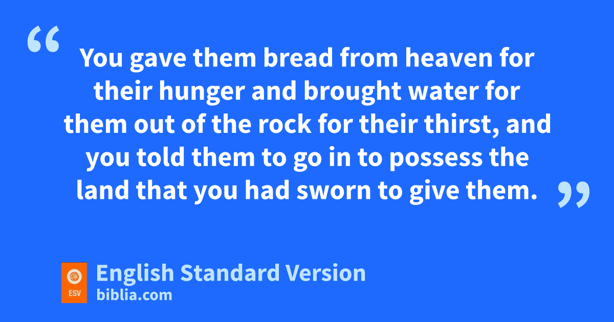 9 p“And you saw the affliction of our fathers in Egypt and heard qtheir cry at the Red Sea, 10 rand performed signs and wonders against Pharaoh and all his servants and all the people of his land, for you knew that sthey acted arrogantly against our fathers. And tyou made a name for yourself, as it is to this day. 11 uAnd you divided the sea before them, so that they went through the midst of the sea on dry land, and you cast their pursuers into the depths, vas a stone into mighty waters. 12 By wa pillar of cloud you led them in the day, and by a pillar of fire in the night to light for them the way in which they should go. 13 xYou came down on Mount Sinai yand spoke with them from heaven and gave them zright rules and true laws, good statutes and commandments, 14 aand you made known to them your holy Sabbath and commanded them commandments and statutes and a law by Moses your servant. 15 bYou gave them bread from heaven for their hunger and cbrought water for them out of the rock for their thirst, and you dtold them to go in to possess the land that you had sworn to give them.