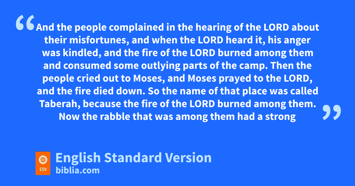 11 And tthe people complained in the hearing of the Lord about their misfortunes, and when the Lord heard it, uhis anger was kindled, and vthe fire of the Lord burned among them and consumed some outlying parts of the camp. 2 Then wthe people cried out to Moses, xand Moses prayed to the Lord, and the fire died down. 3 So the name of that place was called yTaberah,1 because the fire of the Lord burned among them.