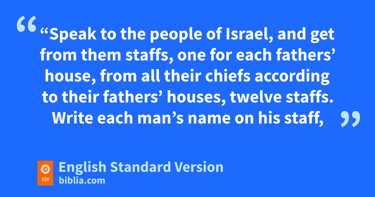17 1 The Lord spoke to Moses, saying, 2 h“Speak to the people of Israel, and get from them staffs, one for each fathers’ house, from all their chiefs according to their fathers’ houses, twelve staffs. Write each man’s name on his staff, 3 and write Aaron’s name on the staff of Levi. For there shall be one staff for the head of each fathers’ house. 4 Then you shall deposit them in the tent of meeting before the testimony, iwhere I meet with you. 5 And the staff of the man jwhom I choose shall sprout. Thus I will make to cease from me kthe grumblings of the people of Israel, which they grumble against you.” 6 Moses spoke to the people of Israel. And all their chiefs gave him staffs, one for each chief, according to their fathers’ houses, twelve staffs. And the staff of Aaron was among their staffs. 7 And Moses deposited the staffs before the Lord in lthe tent of the testimony.