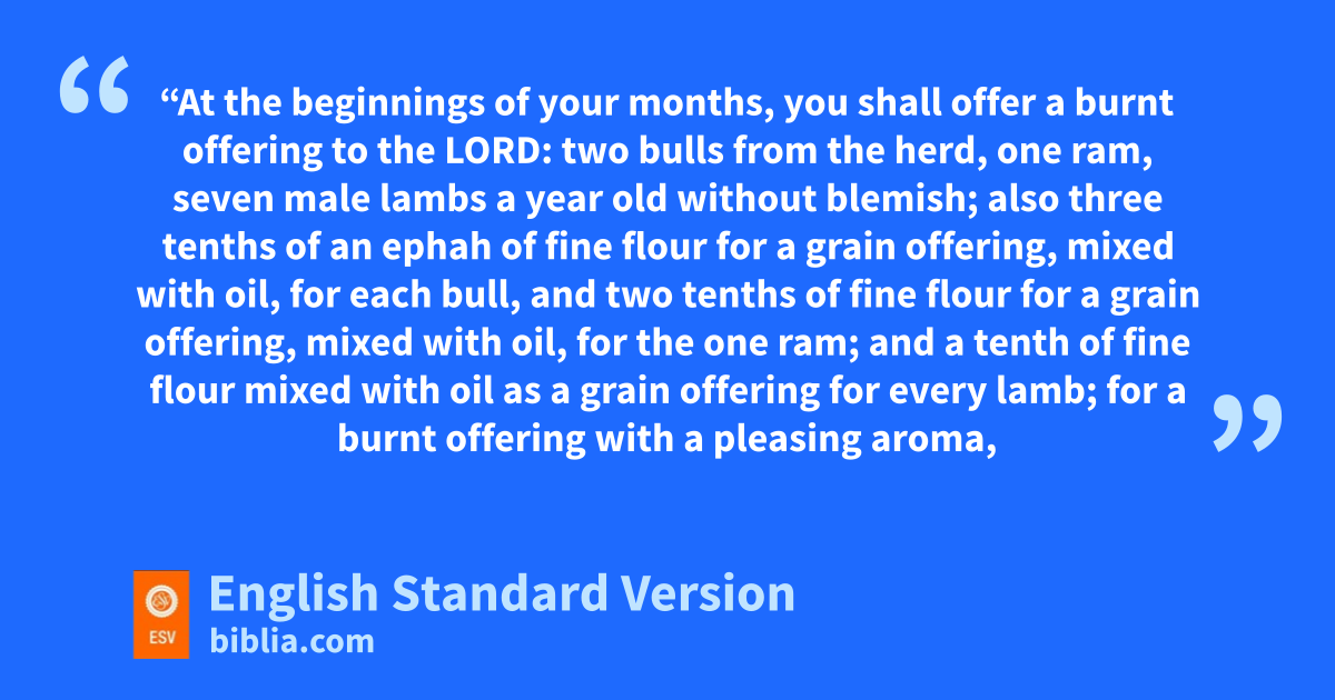11 d“At the beginnings of your months, you shall offer a burnt offering to the Lord: two bulls from the herd, one ram, seven male lambs a year old without blemish; 12 also ethree tenths of an ephah of fine flour for a grain offering, mixed with oil, for each bull, and two tenths of fine flour for a grain offering, mixed with oil, for the one ram; 13 and a tenth of fine flour mixed with oil as a grain offering for every lamb; for a burnt offering with a pleasing aroma, a food offering to the Lord. 14 Their drink offerings shall be half a hin of wine for a bull, a third of a hin for a ram, and a quarter of a hin for a lamb. This is the burnt offering of each month throughout the months of the year. 15 Also fone male goat for a sin offering to the Lord; it shall be offered besides the regular burnt offering and its drink offering.