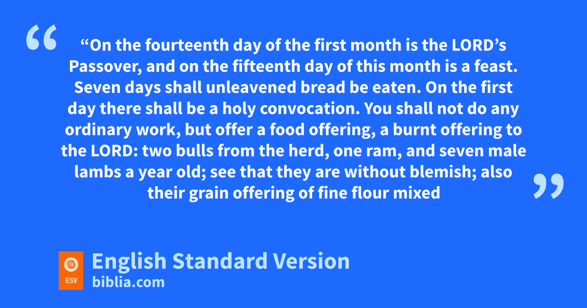 16 g“On the fourteenth day of the first month is the Lord’s Passover, 17 hand on the fifteenth day of this month is a feast. Seven days shall unleavened bread be eaten. 18 iOn the first day there shall be a holy convocation. You shall not do any ordinary work, 19 but offer a food offering, a burnt offering to the Lord: two bulls from the herd, one ram, and seven male lambs a year old; jsee that they are without blemish; 20 also their grain offering of fine flour mixed with oil; three tenths of an ephah shall you offer for a bull, and two tenths for a ram; 21 a tenth shall you offer for each of the seven lambs; 22 also kone male goat for a sin offering, to make atonement for you. 23 You shall offer these besides the burnt offering of the morning, which is for a regular burnt offering. 24 In the same way you shall offer daily, for seven days, the food of a food offering, with a pleasing aroma to the Lord. It shall be offered besides the regular burnt offering and its drink offering. 25 And lon the seventh day you shall have a holy convocation. You shall not do any ordinary work.