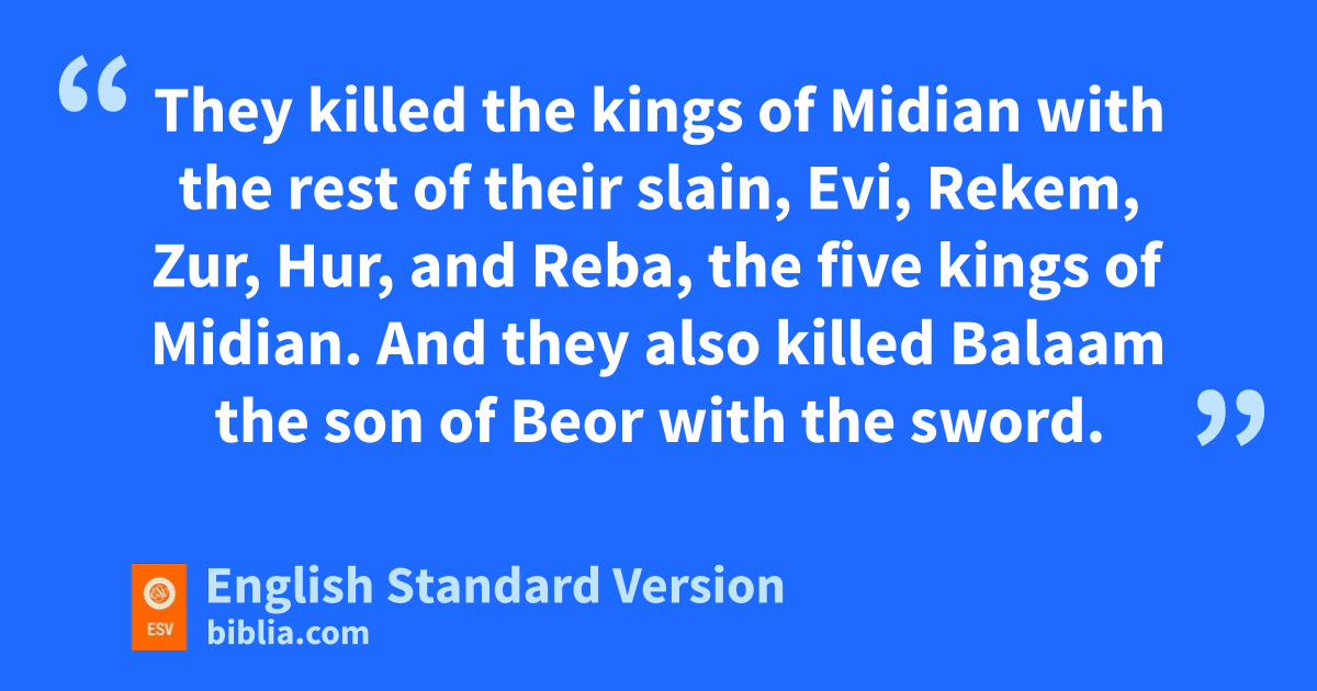 31 The Lord spoke to Moses, saying, 2 n“Avenge the people of Israel on the Midianites. Afterward you shall obe gathered to your people.” 3 So Moses spoke to the people, saying, “Arm men from among you for the war, that they may go against Midian to execute the Lord’s vengeance on Midian. 4 You shall send a thousand from each of the tribes of Israel to the war.” 5 So there were provided, out of the thousands of Israel, a thousand from each tribe, twelve thousand parmed for war. 6 And Moses sent them to the war, a thousand from each tribe, together with Phinehas the son of Eleazar the priest, with the vessels of the sanctuary and qthe trumpets for the alarm in his hand. 7 They warred against Midian, as the Lord commanded Moses, and rkilled every male. 8 They killed the kings of Midian with the rest of their slain, sEvi, Rekem, tZur, Hur, and Reba, the five kings of Midian. And they also killed uBalaam the son of Beor with the sword. 9 And the people of Israel took captive the women of Midian and their little ones, and they took as plunder all their cattle, their flocks, and all their goods. 10 All their cities in the places where they lived, and all their vencampments, they burned with fire, 11 wand took all the spoil and all the plunder, both of man and of beast. 12 Then they brought the captives and the plunder and the spoil to Moses, and to Eleazar the priest, and to the congregation of the people of Israel, at the camp on xthe plains of Moab by the Jordan at Jericho.