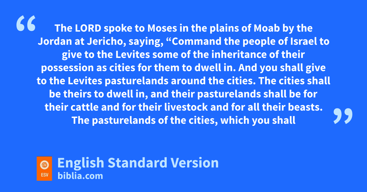 35 The Lord spoke to Moses in sthe plains of Moab by the Jordan at Jericho, saying, 2 t“Command the people of Israel to give to the Levites some of the inheritance of their possession as cities for them to dwell in. And you shall give to the Levites pasturelands around the cities. 3 The cities shall be theirs to dwell in, and their pasturelands shall be for their cattle and for their livestock and for all their beasts. 4 The pasturelands of the cities, which you shall give to the Levites, shall reach from the wall of the city outward a thousand cubits1 all around. 5 And you shall measure, outside the city, on the east side two thousand cubits, and on the south side two thousand cubits, and on the west side two thousand cubits, and on the north side two thousand cubits, the city being in the middle. This shall belong to them as pastureland for their cities.