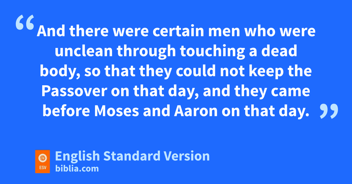 9 And the Lord spoke to Moses in the wilderness of Sinai, din the first month of the second year after they had come out of the land of Egypt, saying, 2 “Let the people of Israel keep the Passover at its appointed time. 3 eOn the fourteenth day of this month, at twilight, you shall keep it at its appointed time; according to all its statutes and all its rules you shall keep it.” 4 So Moses told the people of Israel that they should keep the Passover. 5 And they kept the Passover in the first month, on the fourteenth day of the month, at twilight, in the wilderness of Sinai; according to all that the Lord commanded Moses, so the people of Israel did. 6 And there were certain men who were funclean through touching a dead body, so that they could not keep the Passover on that day, and gthey came before Moses and Aaron on that day. 7 And those men said to him, “We are unclean through touching a dead body. Why are we kept from bringing the Lord’s hoffering at its appointed time among the people of Israel?” 8 And Moses said to them, “Wait, that iI may hear what the Lord will command concerning you.”