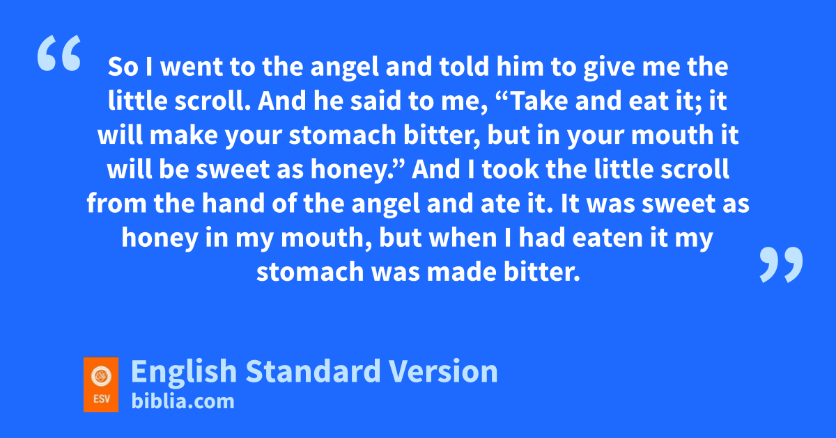 8 Then the voice that I had heard from heaven spoke to me again, saying, “Go, take the scroll that is open in the hand of the angel who is standing on the sea and on the land.” 9 So I went to the angel and told him to give me the little scroll. And he said to me, j“Take and keat it; it will make your stomach bitter, but in your mouth it will be sweet as honey.” 10 And I took the little scroll from the hand of the angel and ate it. It was sweet as honey in my mouth, but when I had eaten it my stomach was made bitter. 11 And I was told, l“You must again prophesy about many peoples and nations and languages and kings.”