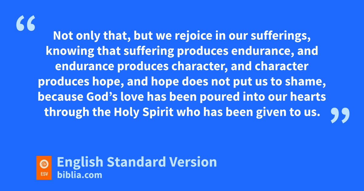 5 aTherefore, since we have been justified by faith, bwe1 have peace with God through our Lord Jesus Christ. 2 Through him we have also cobtained access by faith2 into this grace din which we stand, and ewe3 rejoice4 in hope of the glory of God. 3 Not only that, but we frejoice in our sufferings, knowing that suffering gproduces endurance, 4 and endurance produces character, and character produces hope, 5 and hhope does not put us to shame, because God’s love ihas been poured into our hearts through the Holy Spirit who has been given to us.