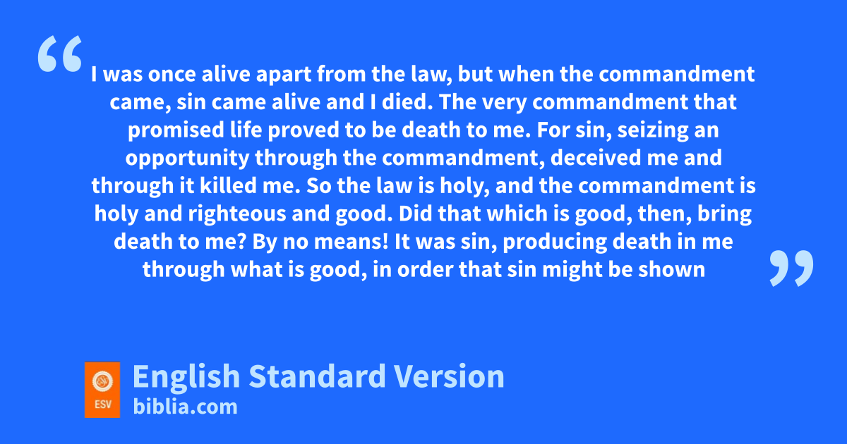 7 What then shall we say? That the law is sin? By no means! Yet if it had not been for the law, oI would not have known sin. For I would not have known what it is to covet if pthe law had not said, “You shall not covet.” 8 But sin, qseizing an opportunity through the commandment, produced in me all kinds of covetousness. rFor apart from the law, sin lies dead. 9 I was once alive apart from the law, but when the commandment came, sin came alive and I died. 10 The very commandment sthat promised life proved to be death to me. 11 For sin, tseizing an opportunity through the commandment, udeceived me and through it killed me. 12 So vthe law is holy, and the commandment is holy and righteous and good.