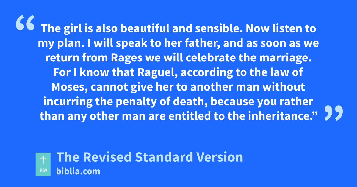 9 When they approached Ecbatana, 10 the angel said to the young man, “Brother, today we shall stay with Raguel. He is your relative, and he has an only daughter named Sarah. I will suggest that she be given to you in marriage, 11 because you are entitled to her and to her inheritance, for you are her only eligible kinsman. 12 The girl is also beautiful and sensible. Now listen to my plan. I will speak to her father, and as soon as we return from Rages we will celebrate the marriage. For I know that Raguel, according to the law of Moses, cannot give her to another man without incurring the penalty of death, because you rather than any other man are entitled to the inheritance.”