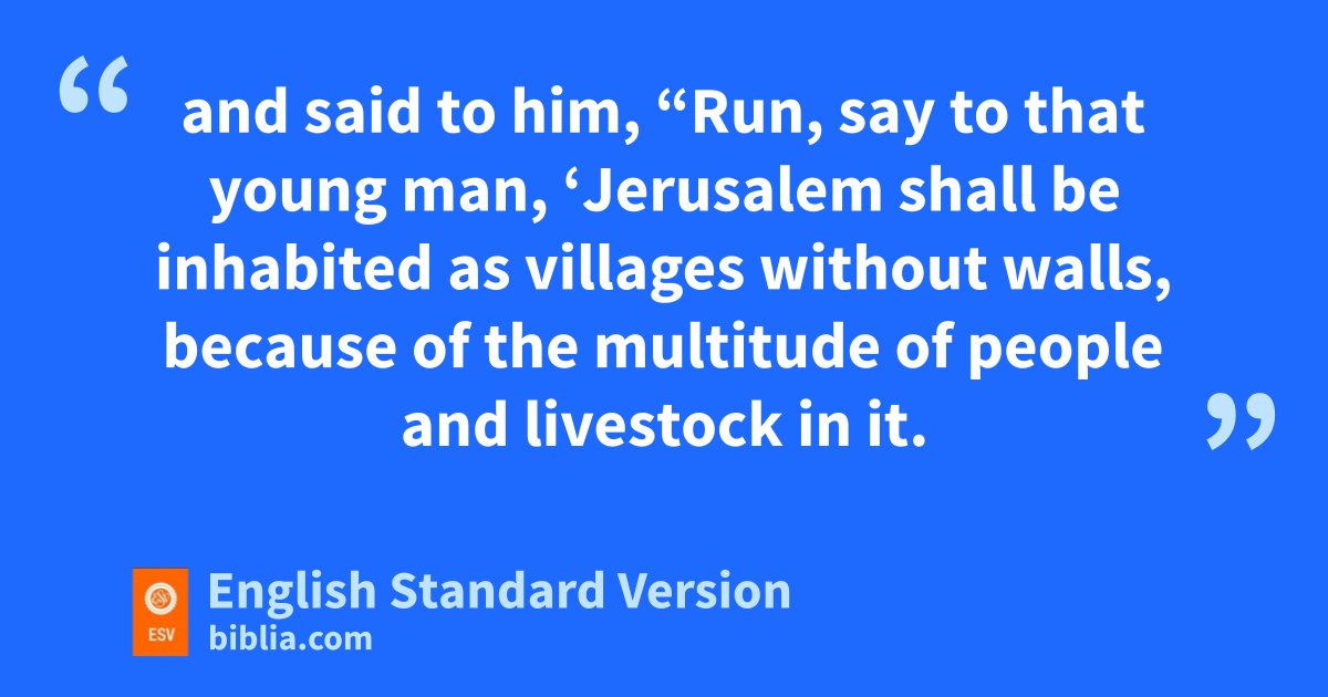 2 1 And I lifted my eyes and saw, and behold, oa man with a measuring line in his hand! 2 Then I said, “Where are you going?” And he said to me, p“To measure Jerusalem, to see what is its width and what is its length.” 3 And behold, qthe angel who talked with me came forward, and another angel came forward to meet him 4 and said to him, “Run, say to that young man, r‘Jerusalem shall be inhabited sas villages without walls, because of tthe multitude of people and livestock in it. 5 And I will be to her ua wall of fire all around, declares the Lord, and I will be the glory in her midst.’ ”