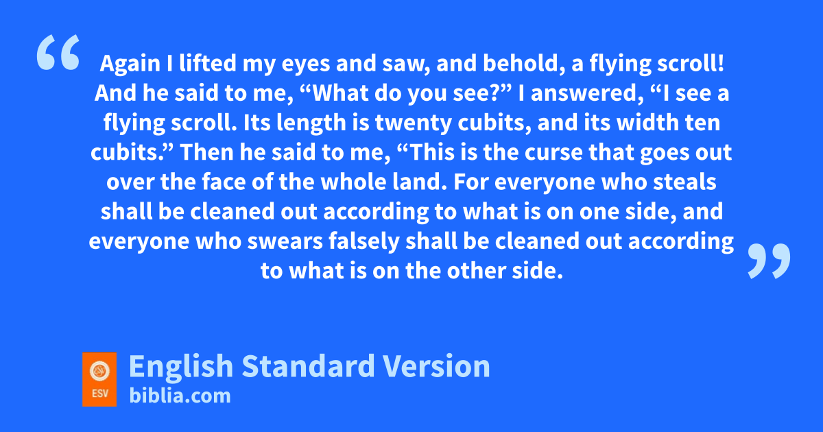5 Again I lifted my eyes and saw, and behold, a flying ascroll! 2 And he said to me, “What do you see?” I answered, “I see a flying ascroll. Its length is twenty cubits, and its width ten cubits.”1 3 Then he said to me, “This is bthe curse that goes out over the face of the whole land. For everyone who csteals shall be cleaned out according to what is on one side, and everyone who dswears falsely2 shall be cleaned out according to what is on the other side. 4 I will send it out, declares the Lord of hosts, and it shall enter the house of the thief, and the house of ehim who swears falsely by my name. And fit shall remain in his house and gconsume it, both timber and stones.”